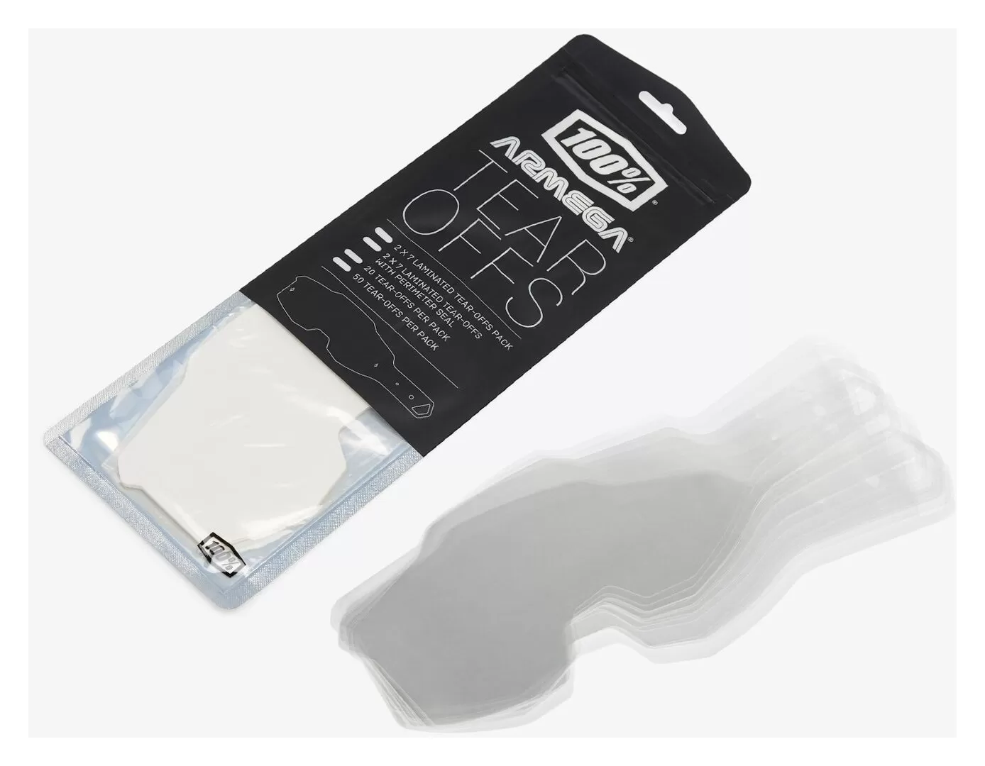 Tear-off films for the 100% Armega Goggles with the Forecast Fog System installed. All films are laminated and available in standard versions or with a perimeter seal.Â