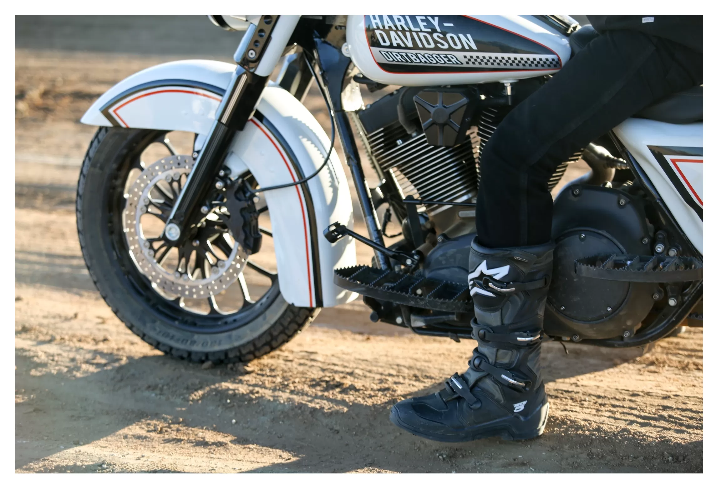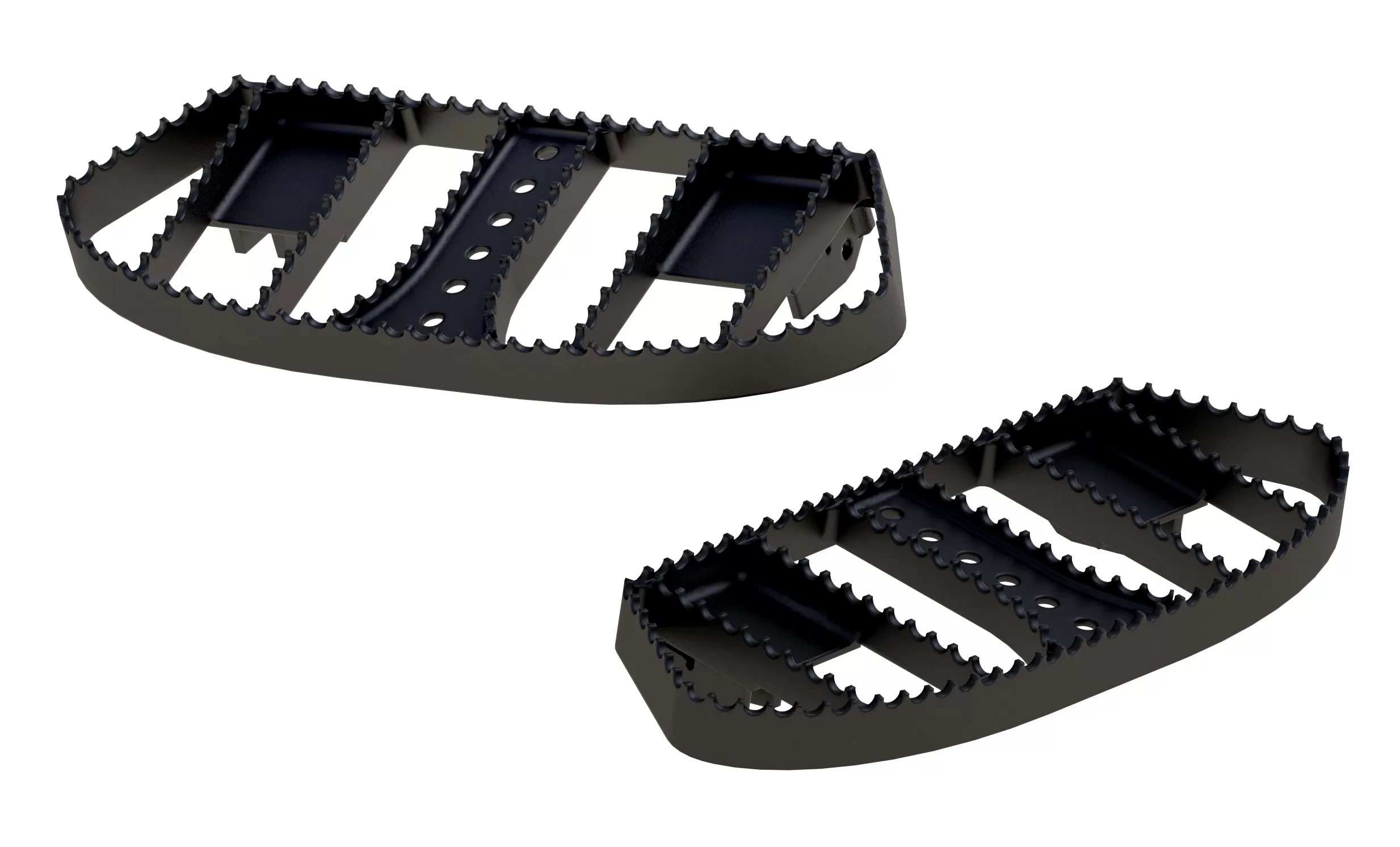 Based off the aesthetic of the original MX-style Burly pegs, they took that moto style and came up with MX-style driver floorboards for H-D FL models. They are made of steel with just the right amount of serration to keep your feet planted. They are also TIG welded for strength and then powder-coated satin black to blend nicely with your bike.