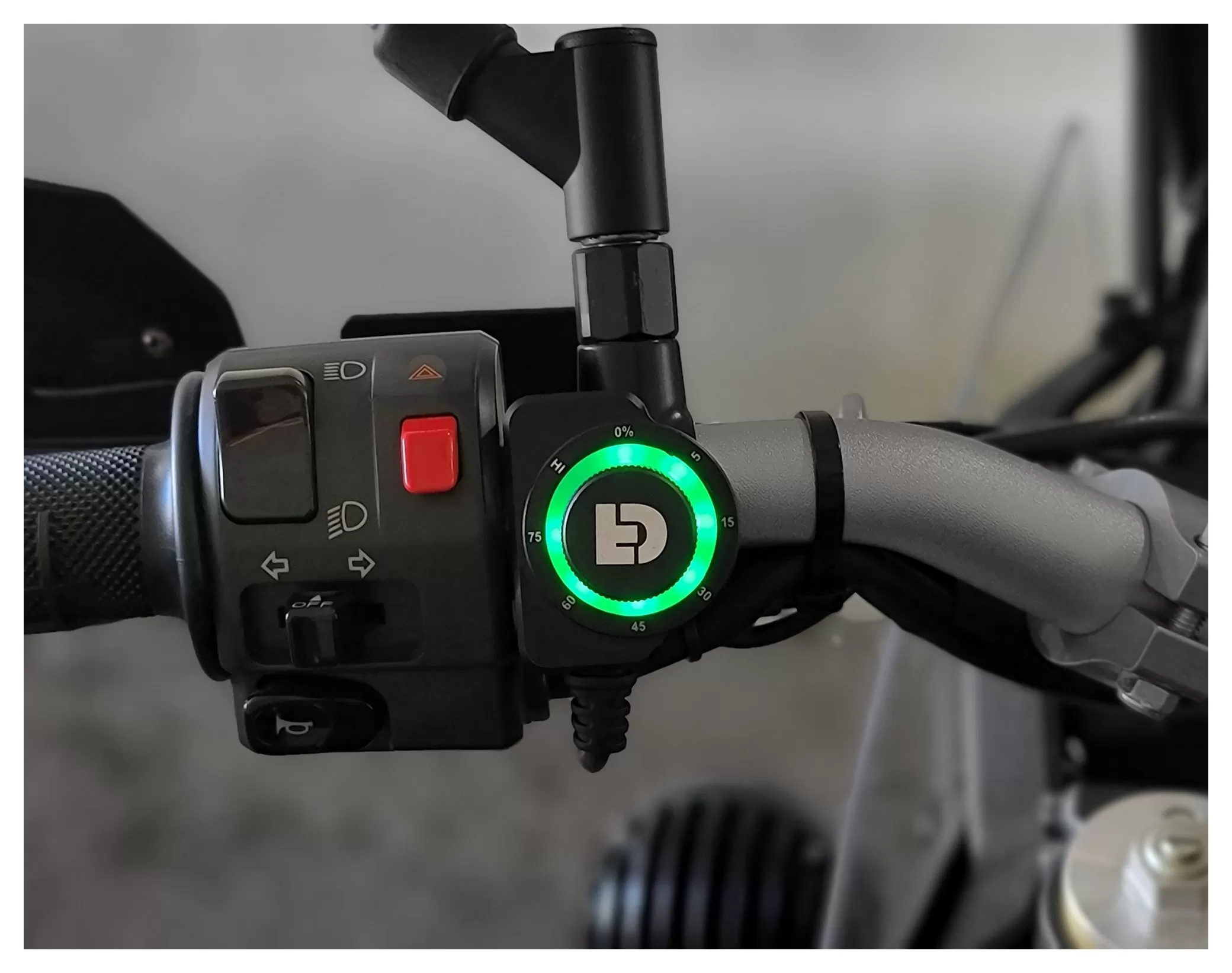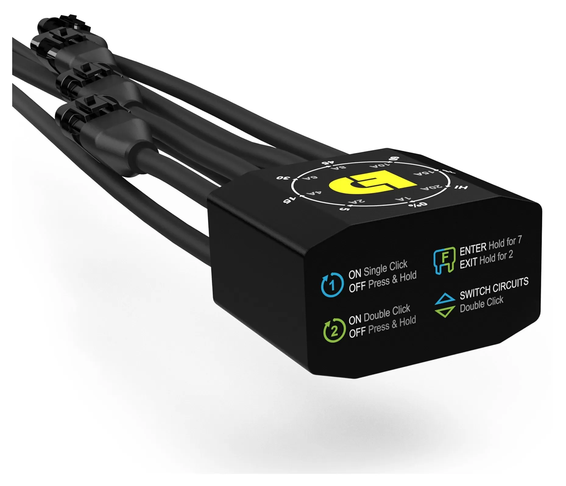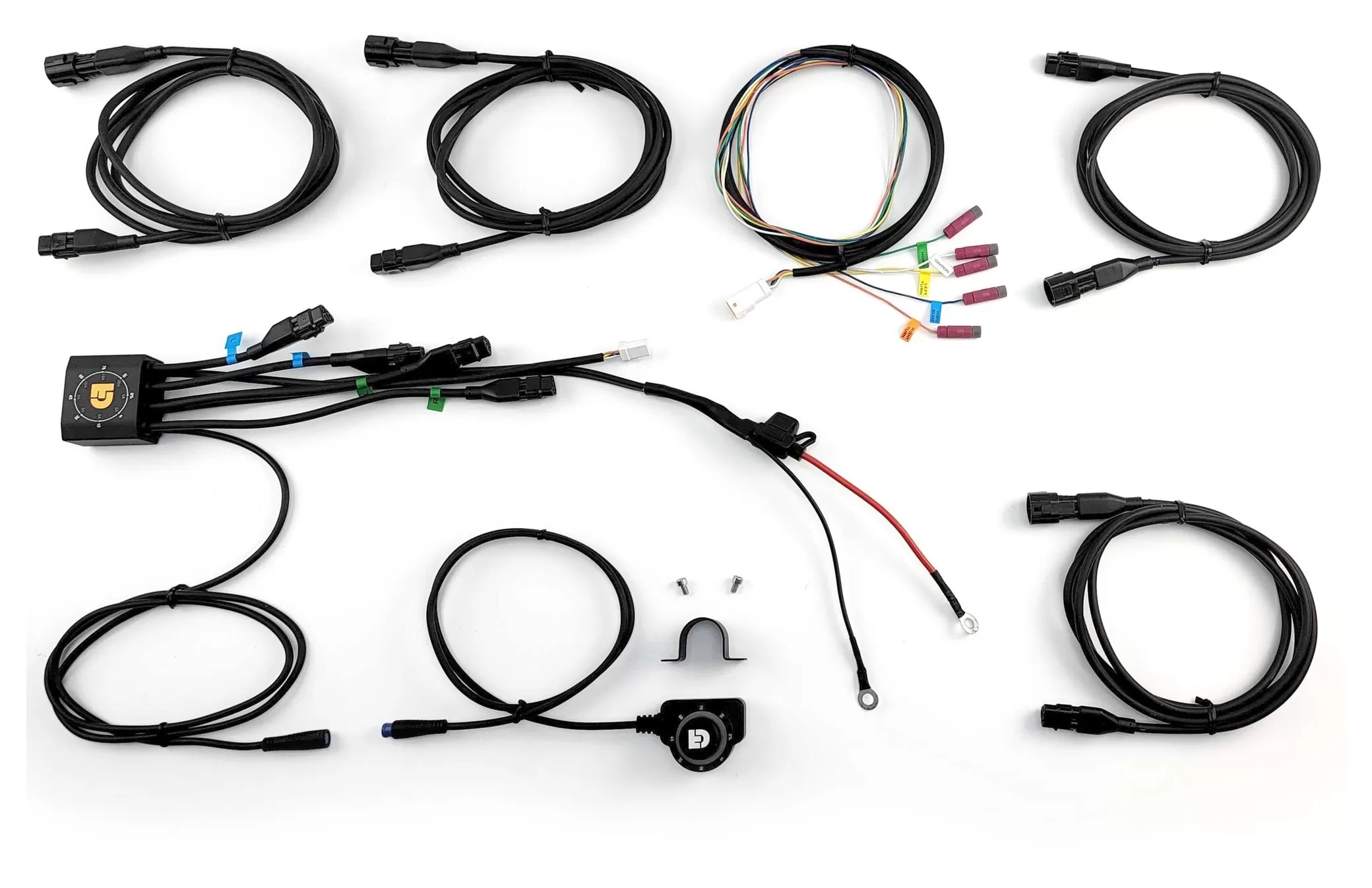 Get ultimate control of the lighting on your bike, UTV or ATV for the optimal safety and visibility with the Denali DialDim Lighting Controller. The DialDim Lighting Controller features a multicolor halo dimming switch that allows you to independently turn on/off and dim two sets of auxiliary lights from a single consolidated wiring harness. The LED halo switch displays your exact settings and allows for effortless dimming on the fly. The controller also features high beam, turn signal, and horn inputs to unlock intelligent flash features that can cancel your aux lights with your turn signal, flash your aux lights as a turn signal, or strobe your lights when you sound your horn.