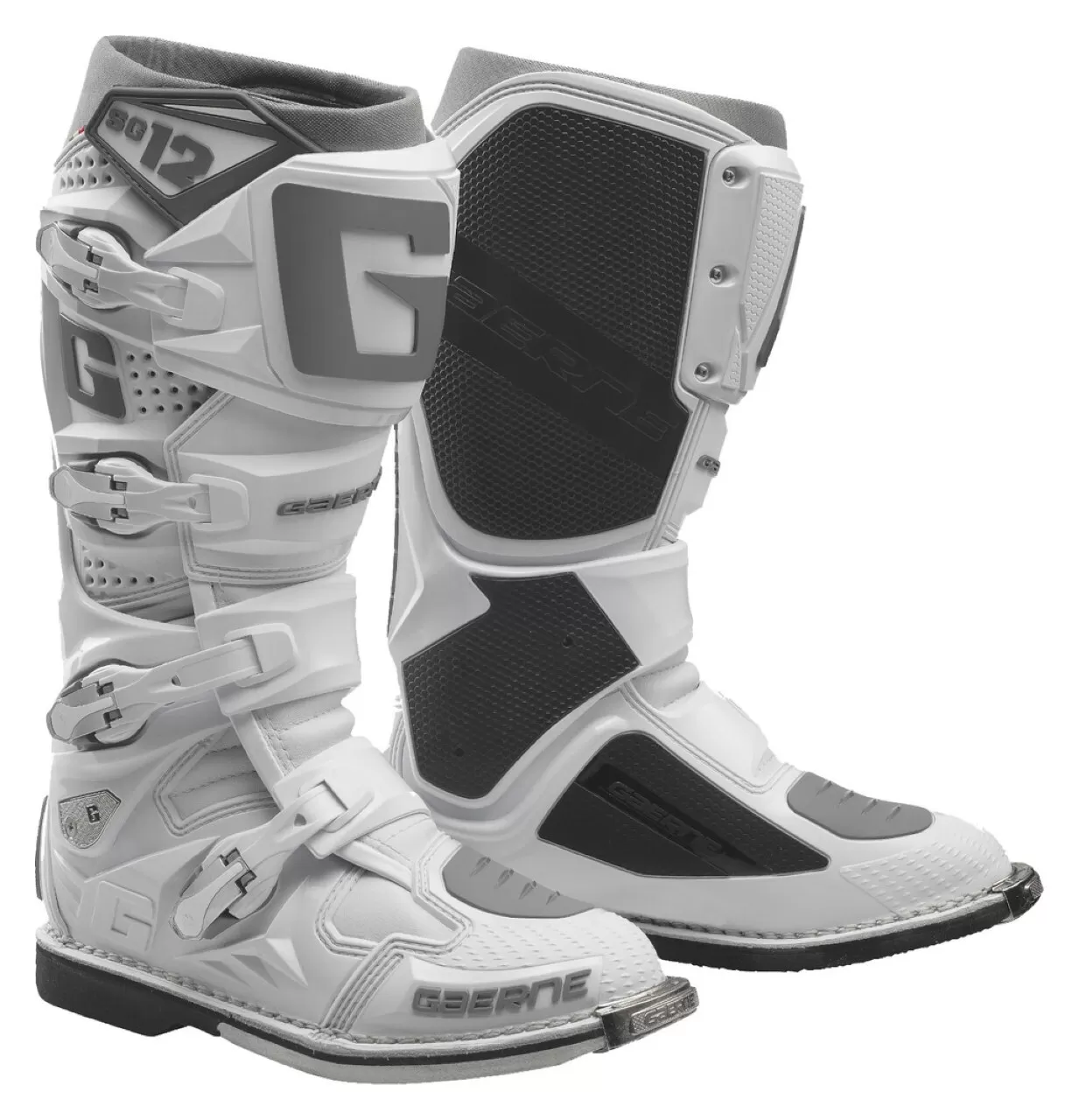 Gaerne continues to kill the game with their pro-level Motocross boot, the SG-12. The revolutionary design of the Dual Stage Pivot System is patented and exclusive to Gaerne, assuring it to be a success. The first pivot is attached to the “razorback”, which provides a rigid component and offers strong lateral support while a glideplate keeps the upper in a firm, upright position. The SG-12 utilizes four lightweight alloy buckles that attach to an adjustable strap. This is a “Tried and True” system that provides the rider with an “Easy in” and “Easy out” non failure system.