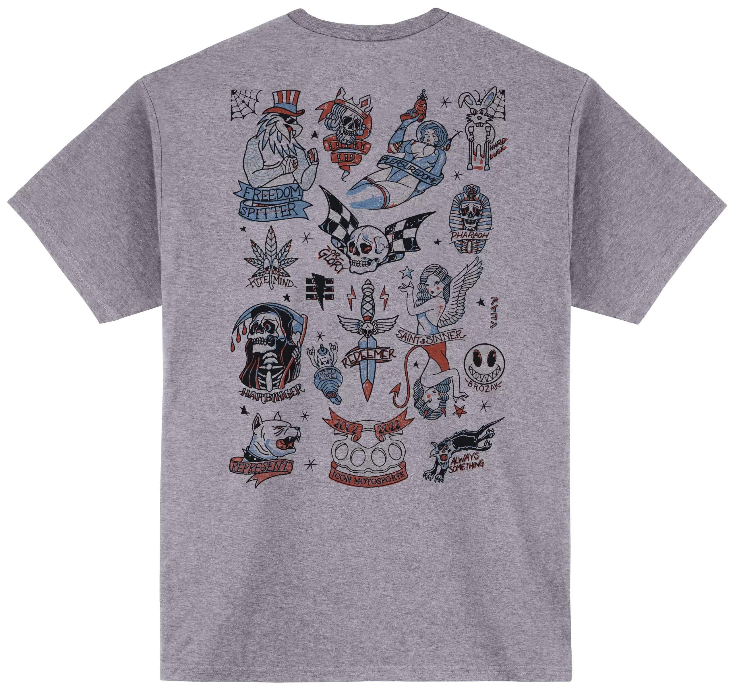 American traditional tattoos penned by a traditional American sailor proudly cover the cover the Stick And Poke T-Shirt from Icon.