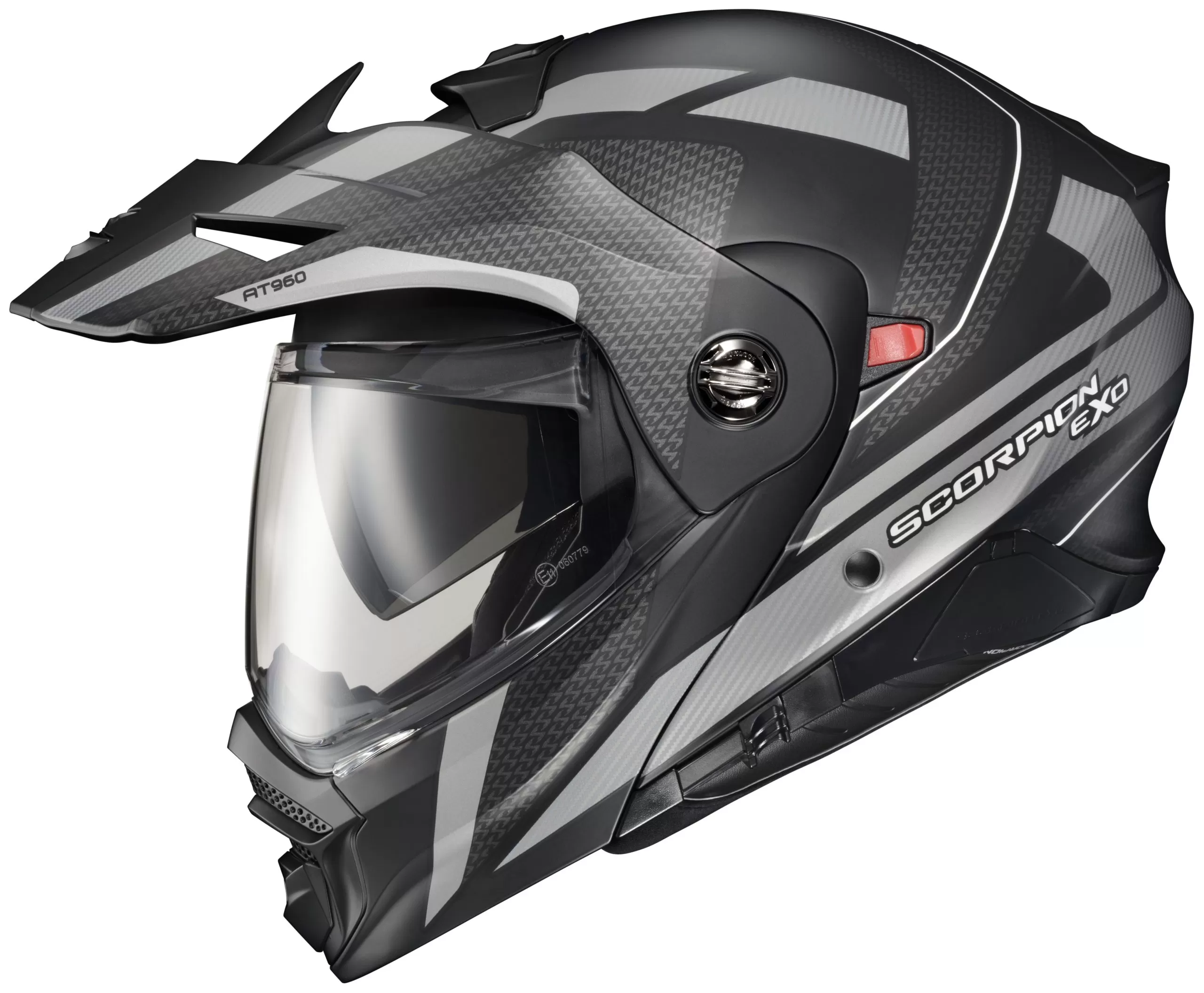 The Scorpion EXO-AT960 Modular Helmet has evolved from the super popular Scorpion EXO-AT950 Adventure Motorcycle helmet. The EXO-AT960 can be used as a full face ADV helmet with external peak visor attached, or the peak visor can be removed for a more aerodynamic touring helmet. An oversized eye port is extremely wide for greater peripheral vision and downward visibility, and the modular chin bar can be conveniently flipped up. The internal drop down Speedview sun-visor allows you to adjust to changing lighting conditions throughout the day. And for those who need to stay connected, the EXO-AT960 was specifically designed to integrate with the new EXO-COM BlueTooth Communicator Kit while the large speaker pockets also make it compatible with many other Bluetooth systems.